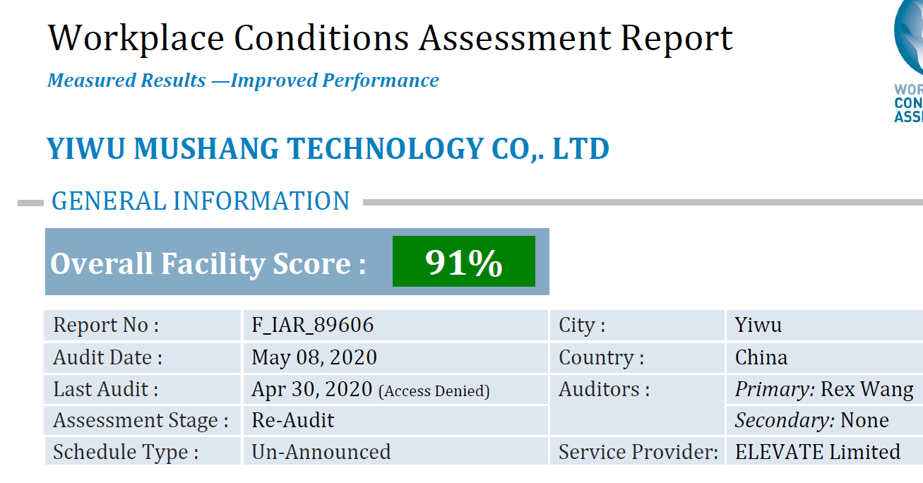 祝義烏市木上電子科技有限公司在創(chuàng)思維驗廠網(wǎng)輔導下順利通過ELEVATE審核的WCA驗廠并取得91分
