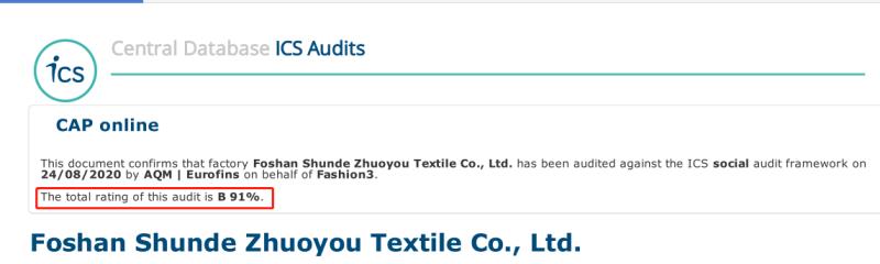 祝佛山市順德區(qū)卓優(yōu)紡織品有限公司在創(chuàng)思維驗(yàn)廠網(wǎng)輔導(dǎo)下一次性通過AQM審核ICS驗(yàn)廠取得B級91分