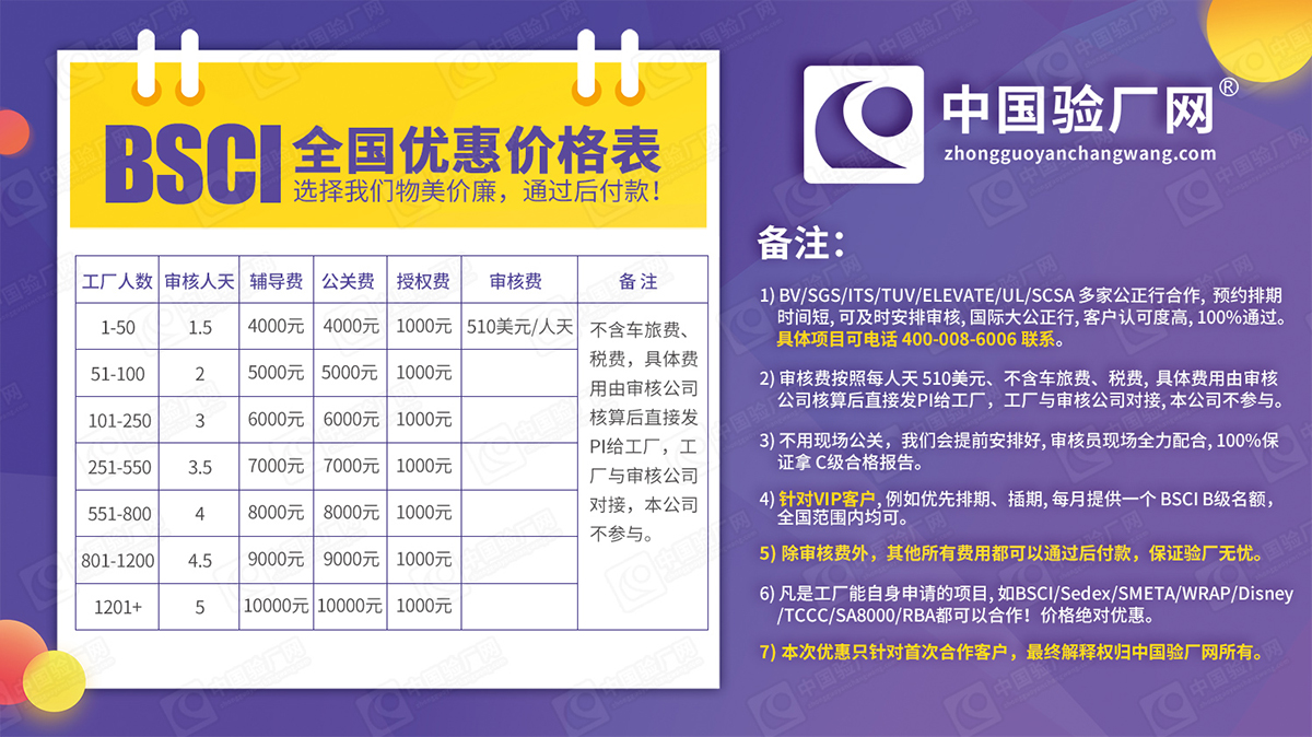 BSCI驗廠是指BSCI(Business Social Compliance Initiative),即倡議商界遵守社會責任組織對BSCI組織成員的全球供應商進行的社會責任審核,主要包括:遵守法律、結社自由和集體談判權利 、禁止歧視 、補償 、工作時間 、工作場所安全 、禁止使用童工、禁止強迫勞工 、環境和安全等問題 。