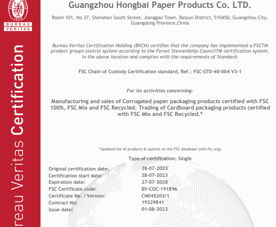 在創思維驗廠網老師專業技術、全程跟進耐心細致輔導以及公司全體員工配合下,一次性順利通過BV- FSC認證,為將來公司發展奠定了良好的發展基礎,既開拓了市場同時也增加了消費者對公司的信賴,在這里再次祝賀廣州宏柏印刷包裝有限公司2023年一次性成功通過BV- FSC認證,同時也期待未來再次與創思維驗廠網合作!