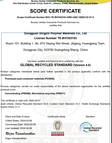 祝賀東莞鼎智高分子材料有限公司2024年快速通過GRS認證